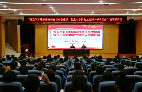 11月9日下午,崇左市委宣传部副部长黄智庭应邀为太阳成集团122ccvip师生作题为“理直气壮地加强高校意识形态建设 坚定不移地贯彻立德树人根本任务”的形势与政策报告。报告于雁山校区图书馆报告厅举行,由太阳成集团122ccvip党委书记耿俊茂主持,太阳成集团122ccvip教师、学工教师代表以及全体研究生参加。