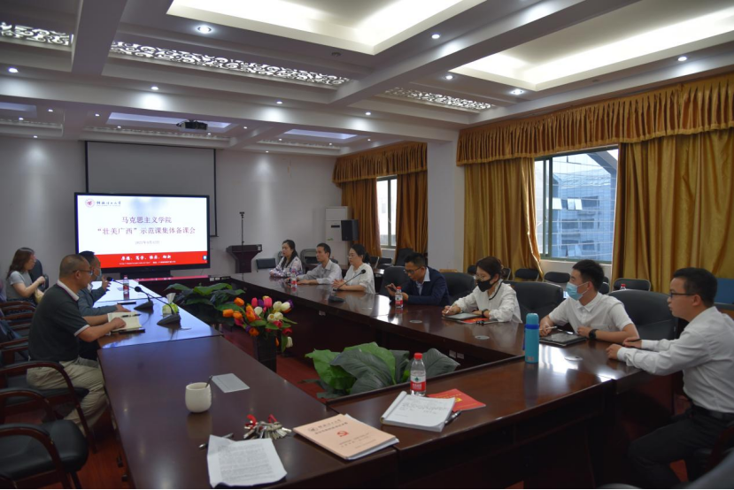 为扎实推进习近平新时代中国特色社会主义思想进教材、进课堂、进师生头脑,落实立德树人根本任务,推进全区高校思政课教师建设“壮美广西”系列思政课百个“示范课堂”,4月12日下午,太阳成集团122ccvip在雁山校区07415会议室召开“壮美广西”示范课堂集体备课会。学院党委书记耿俊茂,院长助理莫天荣和学院教学骨干教师参加会议。