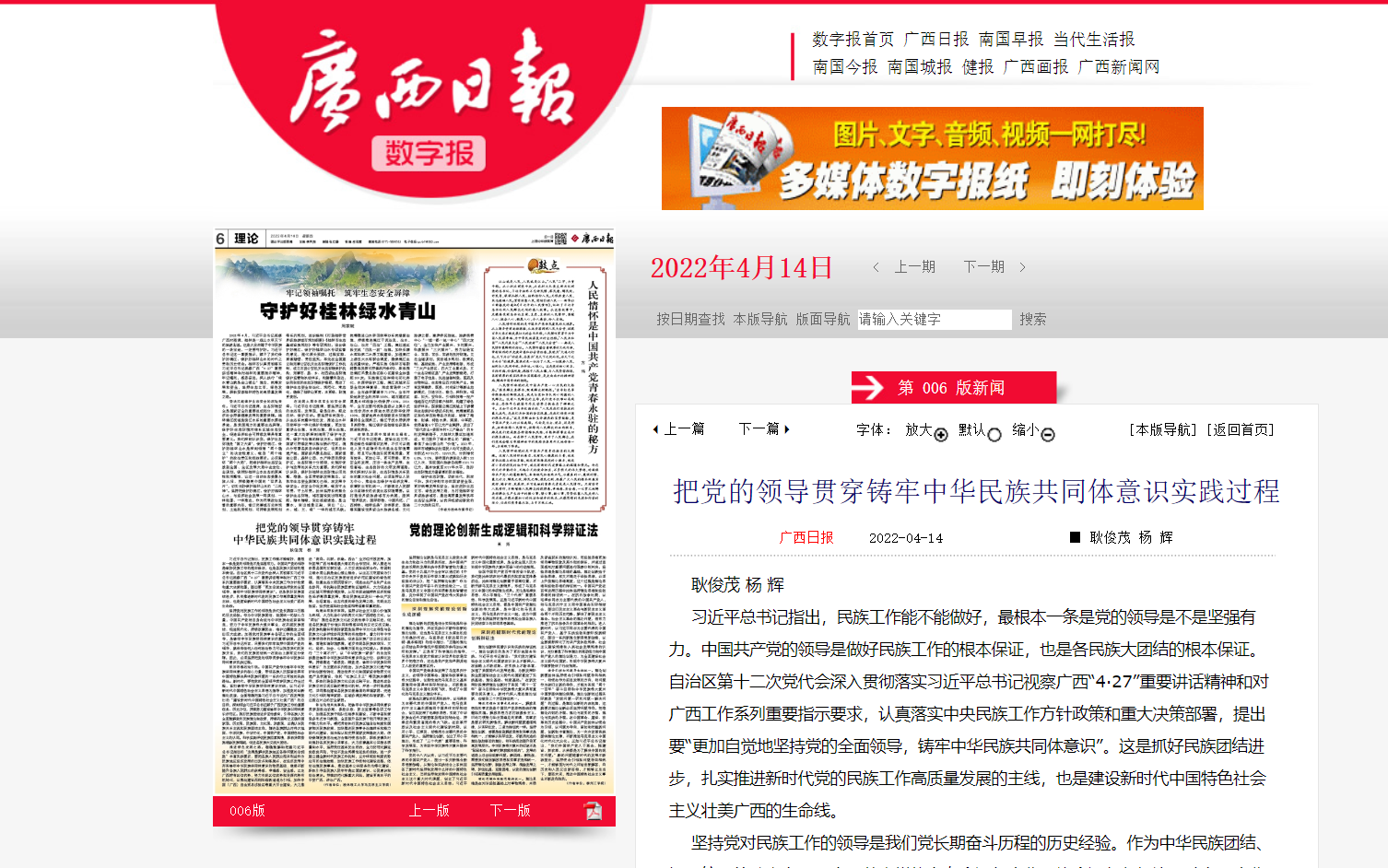 2022年4月14日,太阳成集团122ccvip2020级研究生杨辉在《广西日报》第6版(理论)发表理论文章:《把党的领导贯穿铸牢中华民族共同体意识实践过程》。历年来,太阳成集团122ccvip高度重视学科建设与人才培养,积极打造党建+特色品牌,积极引导学院师生党员将专业知识融入党建特色实践活动中,理论与实践相结合,学以致用,在实践中提升理论素养和专业技能。