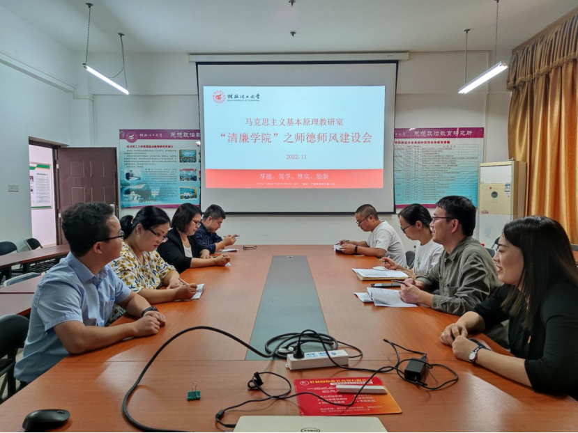 11月4日下午,马克思主义基本原理教研室全体老师在雁山教研室开展了“清廉学院”之师德师风建设会。首先,教研室老师一起学习了《新时代高校教师职业行为十项准则》、《教育部关于高校教师师德失范行为处理的指导意见》和《教育部公布高校教师师德禁行行为“红七条”》以及习近平总书记关于在学校思想政治理论课教师座谈会上的讲话。大家一致认为,修身立德是第一要务,修养一己之师德,并勉以躬行实践。