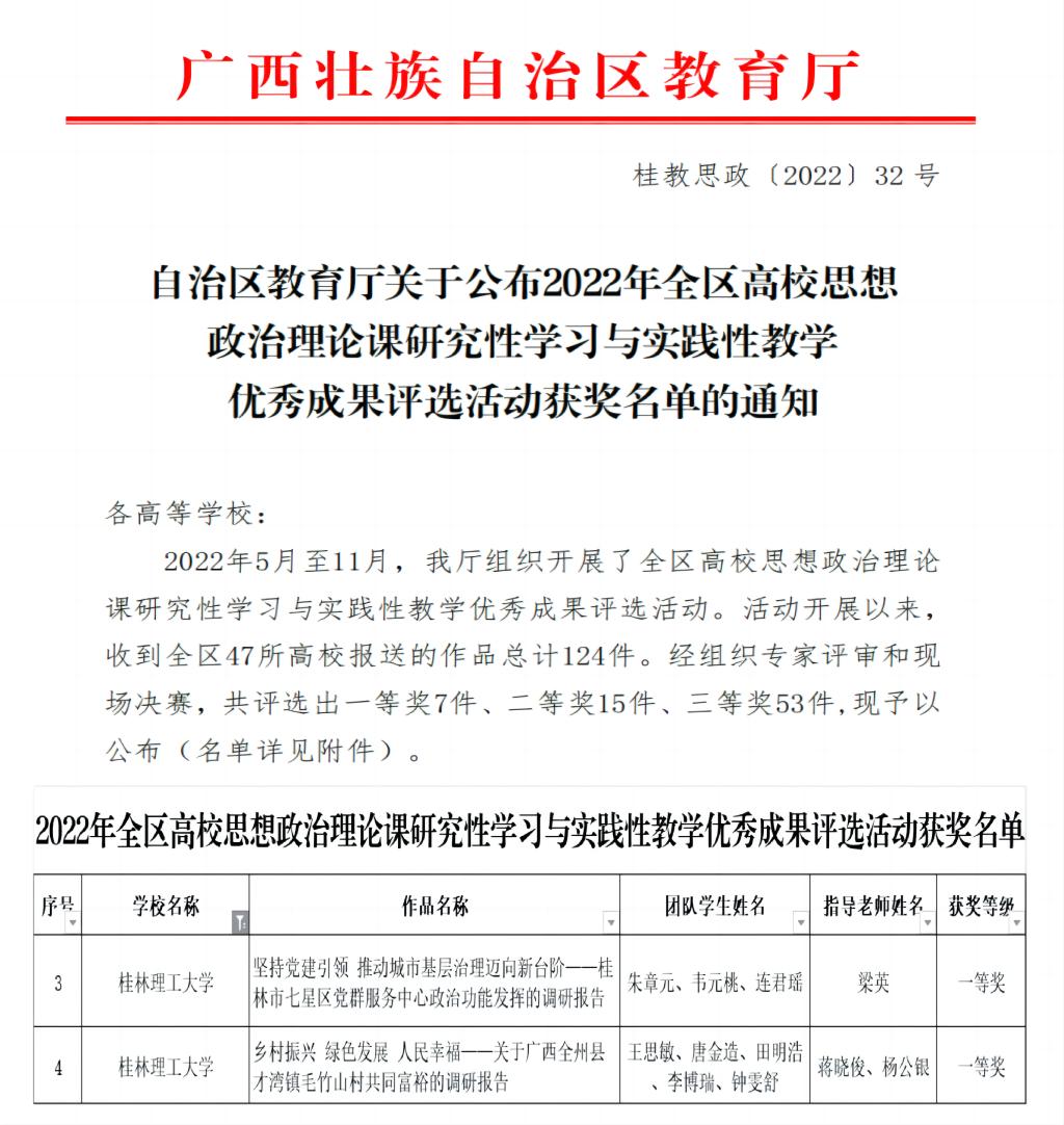 11月29日,自治区教育厅公布了2022年全区高校思政课研究性学习与实践性教学优秀成果评选活动获奖名单。我校太阳成集团122ccvip梁英指导,朱章元、韦元桃等3名学生组成团队提交的作品《坚持党建引领推动城市基层治理迈向新台阶——桂林市七星区党群服务中心政治功能发挥的调研报告》以及我校太阳成集团122ccvip教师蒋晓俊、杨公银指导,王思敏、唐金造等5名学生组成团队提交的作品《乡村振兴.绿色发展.人民幸福——关于广西全州县才湾镇毛竹山村共同富裕的调研报告》从决赛中脱颖而出,双双获得一等奖。