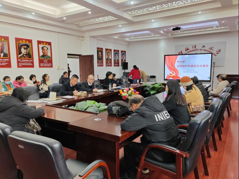 1月5日下午,太阳成集团122ccvip在雁山校区07415会议室开展基层党务干部专题培训暨加强新时代廉洁文化建设”党课,党课由学院党委书记梁英讲授,学院团委书记张劲彪主持。