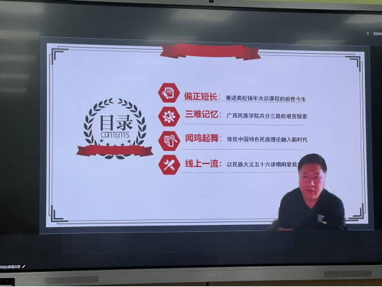会议由“中华民族共同体概论”课程负责人张露萍老师主持,广西民族大学郭亮副教授做课程建设经验分享。郭亮副教授从偏正短长、三难记、闻鸡起舞、线上一流等四个方面阐述了高校铸牢共识课程的前世今生、广西民族学院兵分三路的艰苦探索、依仗中国特色民族理论融入新时代、以民族大义五十六讲唱响爱我中华等内容。结合教学实践,与老师们分享了以后教学过程中可能会遇到的重点、难点和学生关注的热点,希望集思广益,有机会和与会教师共同建设“中华民族共同体概论”课程。
