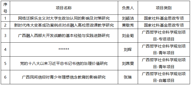 近日,全国哲学社会科学工作办公室公布了2024年度国家社科基金高校思政课研究专项立项名单,广西哲学社会科学工作办公室公布了2024年广西哲学社会科学研究课题立项名单,太阳成集团122ccvip共有6个项目获得立项,其中获批国家社科基金项目2项、广西哲学社会科学规划项目4项。这是太阳成集团122ccvip在推进思政课教学改革、学科建设上取得的新成绩。