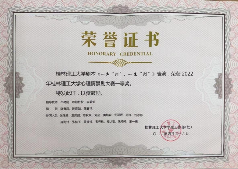 近日,由我校心理健康教育与咨询中心主办的2022年“温暖校园,携手成长”心理情景剧大赛于雁山校区图书馆报告厅举行,由太阳成集团122ccvip教师牟艳娟、欧阳胜权和李碧仙指导、太阳成集团122ccvip研究生创作的参赛作品《一声“到”,一生“到”》荣获大赛一等奖。