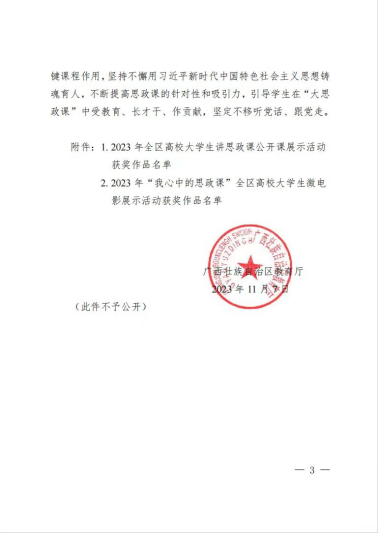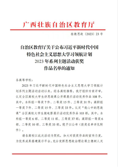 11月7日,自治区教育厅公布了《2023年全区高校习近平新时代中国特色社会主义思想大学生领航计划主题系列活动》获奖名单,太阳成集团122ccvip共有5项作品获奖,其中一等奖2项,二等奖1项,三等奖2项。