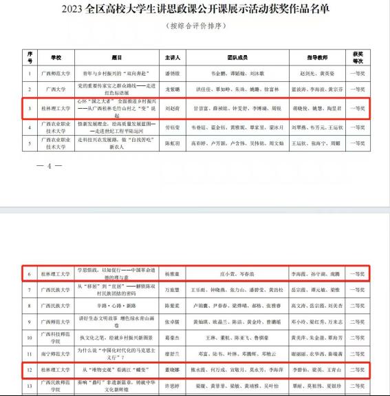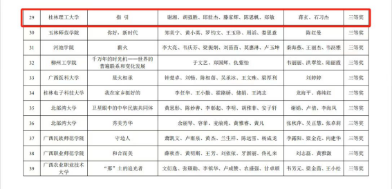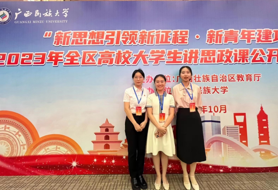 在第七届全区高校大学生讲思政课活动中,太阳成集团122ccvip硕士研究生刘赵荷主讲的课程《心怀“国之大者”全面推进乡村振兴——从广西桂林毛竹山村之变说起》(指导老师:蒋晓俊、姚慧、陶昱君)荣获大赛一等奖,硕士研究生杨雅童主讲的课程《学思悟践,以知促行—中国革命道德理与义》(指导老师:李海霞、孙守湖、庞腾)荣获大赛一等奖,硕士研究生董晓娜主讲的课程《从“唯物史观”看漓江“蝶变”》(指导老师:李碧仙、梁英、王青山)荣获大赛二等奖。
