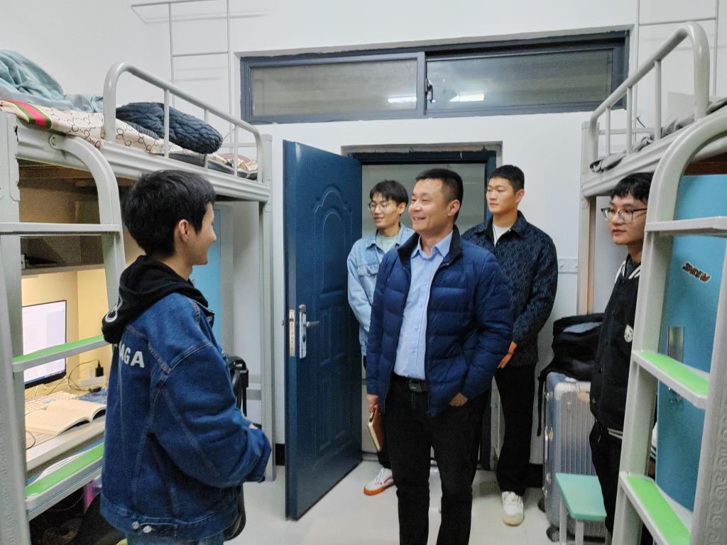 “你来自哪里?学习压力大不大?到这里吃住习惯吗?有什么困难?之前本科是什么专业?”每到一个宿舍,张红勇都对学生们嘘寒问暖,一句句贴心的问候,一句句暖心的话语,传递了学院温暖关怀。