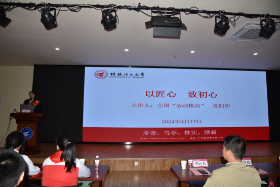 活动中,夏四初结合自己的工作,作了《以匠心,致初心》的报告。她向现场师生们讲述了自己的奋斗故事,用一个个小故事生动阐释了“爱岗敬业、争创一流、艰苦奋斗、勇于创新、淡泊名利、甘于奉献”的劳模精神,让同学们近距离地接触劳动模范、聆听劳模故事,勉励同学们在新时代的背景下,要大力弘扬劳模精神,激励广大学生树立正确的劳动观念,尊重劳动、热爱劳动、投身劳动,为实现社会主义现代化强国目标贡献智慧和力量。