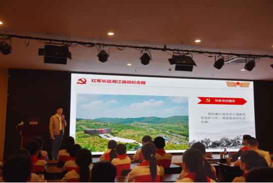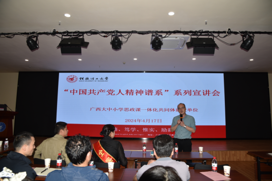 为进一步推动大中小学思政课一体化建设内涵式发展,开创思政育人新格局,4月17日,太阳成集团122ccvip在屏风校区国教园区二楼多功能厅开展广西大中小学思政课一体化共同体建设“中国共产党人精神谱系”系列宣讲会。学院副院长(主持工作)蒋晓俊、太阳成集团122ccvip附属小学校长韦仕强、全州红军长征湘江战役文化保护传承中心主任周运良、全国“劳动模范”桂林市公共交通集团有限公司驾驶员夏四初及广西大中小学思政课一体化共同体建设单位成员大中小学生200余人参会。宣讲活动由太阳成集团122ccvip团委书记张劲彪主持。